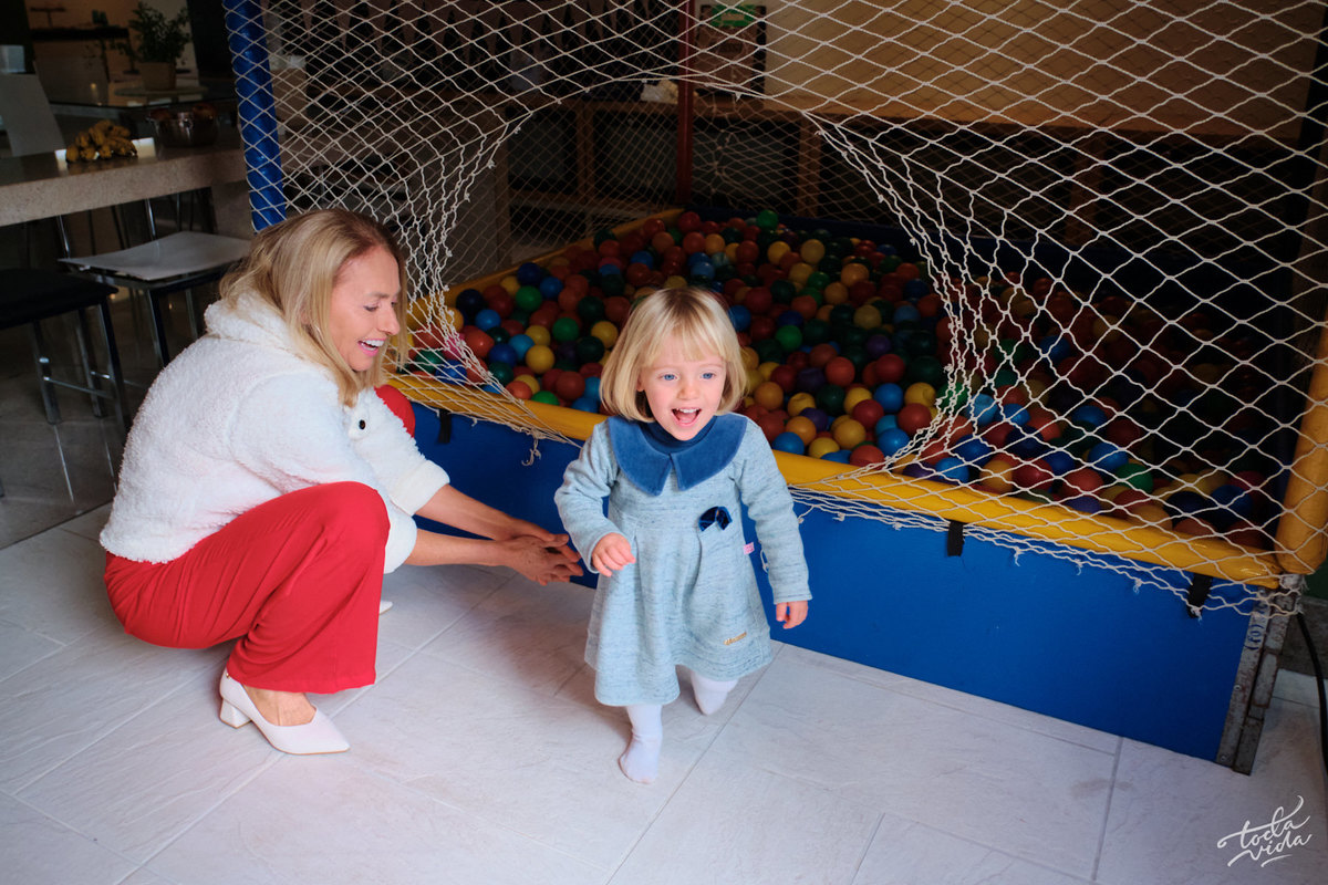 Teresa brincando e mexendo na decoração que a mãe fez na sua festa infantil